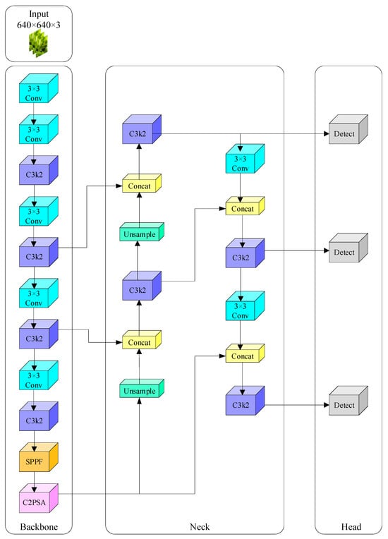 YOLOv11 [18] builds on the capabilities of its predecessors, with YOLOv11n specifically optimized for environments with limited resources. The key distinction of YOLOv11n lies in its parameter count, computational load, and overall size, making it suitable for resource-constrained devices. Figure 1 illustrates the architecture of YOLOv11n. Compared to YOLOv8, YOLOv11 represents a significant advancement by replacing YOLOv8’s C2f structure [19] with the C3k2 (Cross Stage Partial Bottleneck with 3 Conv layers and Key-point Detection) structure in YOLOv11n. This new structure enhances feature capture comprehensively, boosting the convolutional neural network’s feature extraction capability while improving the computational efficiency and further reducing the model size. For YOLOv11n, the C3k2 structure dynamically adjusts the number of channels to better accommodate inputs of various sizes, ensuring adaptability and performance in diverse scenarios.