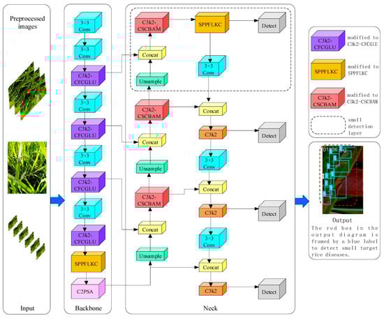 For rice disease detection tasks, agricultural field equipment (such as portable detection devices) typically requires models to be lightweight, low-latency, and highly accurate. Such a model can swiftly and precisely identify rice diseases in complex farmland environments, ensuring the timely implementation of disease management measures to protect the healthy growth and yield of rice. The YOLOv11-RD architecture introduced in this paper, as shown in Figure 2, includes four parts: the input, backbone, neck, and output.