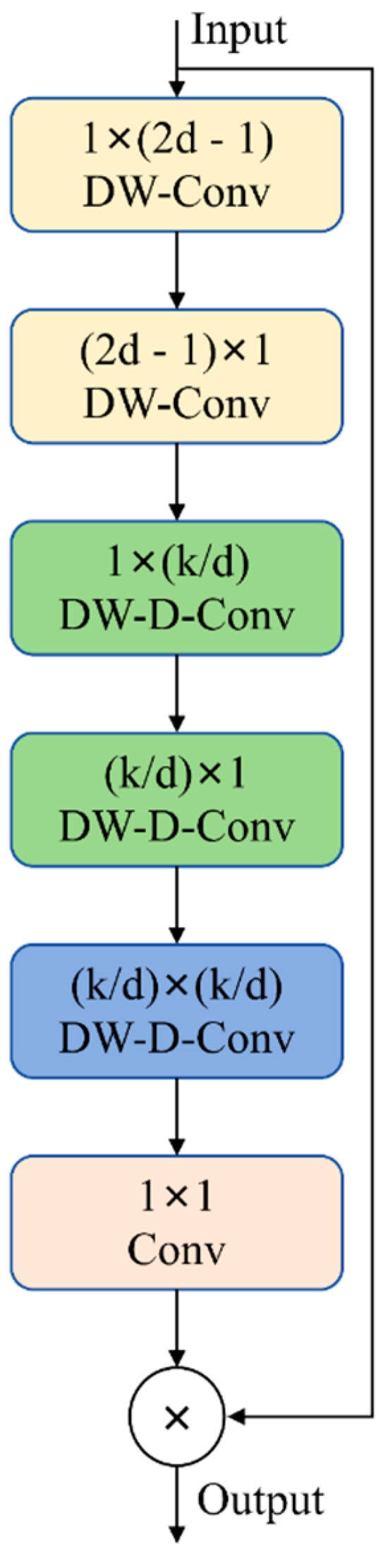 The LSKAC module identifies long-range dependencies through the efficient decomposition of large-kernel convolutions, requiring minimal computation and parameters. The large-kernel convolution is decomposed into three parts: spatial local convolution (depth-wise convolution), termed DW-Conv; spatial remote convolution (depth-wise dilated convolution), labeled DW-D-Conv; and channel-wise 1 × 1 convolution, abbreviated as Conv. Figure 3 shows the LSKAC network structure. First, a 1 × (2d − 1) depth-wise separable convolution captures vertical features and reduces parameters. Then, a (2d − 1) × 1 depth convolution extracts horizontal features, completing the previous step. Next, vertical sparse convolutions are performed using a depth-wise separable sparse convolution with a 1 × (k/d) kernel, broadening the receptive field to detect distant features. Similarly, a (k/d) × 1 depth-wise separable sparse convolution expands the receptive field horizontally. In the 2D direction, a (k/d) × (k/d) depth-wise-expanded convolution further integrates these features. Finally, a 1 × 1 convolution merges the extracted features, reduces the number of channels, and performs element-wise multiplication with the original input feature map to generate the output.