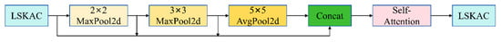 Figure 4 below depicts the SPPFLKC attention mechanism module, reconstructed with LSKAC and comprising LSKAC, MaxPool2d, AvgPool2d, self-attention, and Concat layers.
