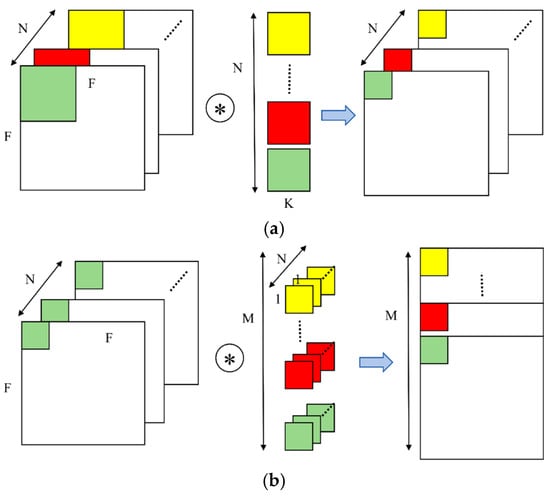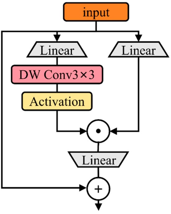 Depth-wise separable convolution splits the standard n × n convolution into two distinct operations, as illustrated in Figure 5. Part (a) shows depth-wise convolution, which applies convolution independently to each input channel, while part (b) depicts point-wise convolution using a 1 × 1 kernel to project the depth-wise convolution results into a new feature space. This method markedly lowers the computational demands as well as the parameter quantity, enabling the more efficient extraction of comprehensive target features. Figure 6 illustrates the concept of gated channel attention, where the mechanism uses a gating signal to dynamically identify important features and suppress irrelevant noise, thereby enhancing the quality of feature representations.