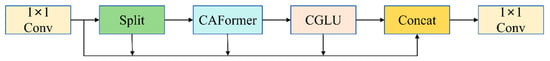 Figure 8 illustrates CAFormer (a neural network architecture that integrates convolution and self-attention mechanisms), which employs a dual-branch setup to improve feature extraction by combining depth-wise separable convolutions with self-attention mechanisms. The entire process is partitioned into two principal phases: feature separation and feature reconstruction.