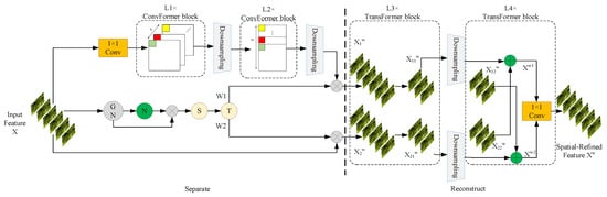 In CAFormer, the input feature map is denoted as X ∈ RC×H×W, where N is the batch dimension, C is the channel dimension, and H and W are the spatial height and width dimensions, respectively. The complete architecture is split into two components: the separation part and the reconstruction part. The separation part incorporates depth-wise separable convolutions. In the sub-branches, convolution layers use learned offsets to adjust the sampling points of the main branch’s convolution layers. The input feature map X first undergoes a 1 × 1 convolution layer for dimensionality reduction; then, depth-wise convolutions are applied for initial processing, producing the L1 feature map. After downsampling, point-wise convolutions further process the feature map, producing the L2 feature map and performing additional downsampling. In the primary branch, the learnable parameter γ ∈ RC from GN indicates pixel variation in each batch and channel space. Following N layers, normalization generates batch- and channel-specific weights Wγ ∈ RC, which are subsequently multiplied with the feature map processed by the GN layer. Next, a Sigmoid function generates weights Wγ in the range of (0, 1), controlled by a thresholding layer t, resulting in two types of weights: informative weights W1 (exceeding the threshold) and non-informative weights W2 (below the threshold). This separates the information and forms two branches.
