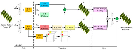 During the transformation phase, Xup serves as a “rich feature extractor”, using parallel group-wise convolution (GWConv) and point-wise convolution (PWConv) to obtain feature details while minimizing computational load. GWConv restricts information flow between channel groups to lower the computational burden, while PWConv remedies any information loss. Aggregated from the generated feature outputs, the feature map Y1 is formed. In the lower transformation stage, Xlow is processed by a 3 × 3 depth-wise separable convolution layer, reducing the computational burden and parameter count while improving feature characterization. A nonlinear activation function boosts expressiveness, and depth-wise separable interpolation with concatenation extracts subtle details from Xlow, augmenting information from the upper branch, culminating in the output Y2.