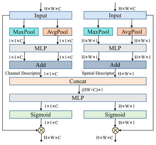 During compression, channel attention and spatial attention operations show notable similarities, both aiming to streamline data and extract essential features. Both utilize max pooling (Max Pool) and average pooling (Avg Pool) to derive information from the input feature map. For channel attention, these two pooling operations generate two 1 × 1 × C channel descriptors. For spatial attention, they produce two H × W × 1 spatial descriptors. Next, these descriptors are processed by a multi-layer perceptron (MLP) and then fused using an addition operation (Add) to generate the final channel descriptor and spatial descriptor.