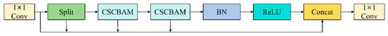 Figure 11 displays the design of the C3k2-CSCBAM, in which the bottleneck layer is replaced by the CSCBAM. To maintain optimization diversity and training stability, a BN layer and a ReLU layer are inserted prior to the fusion process. Although BN and ReLU layers enhance model performance, the excessive use of these layers can add significant computational load during training and may result in overly large model weights. Therefore, to improve computational efficiency, the C3k2-CSCBAM utilizes a sole BN layer and a ReLU layer, markedly decreasing training costs while sustaining model stability and optimization efficiency.
