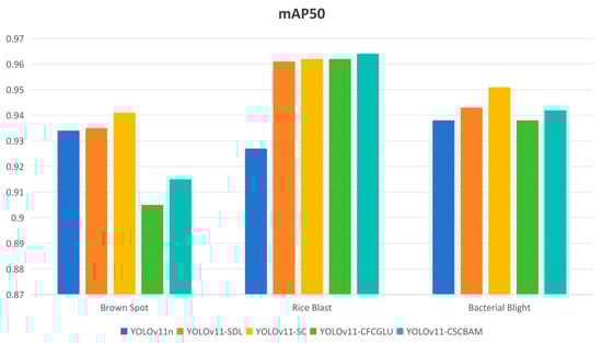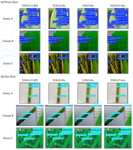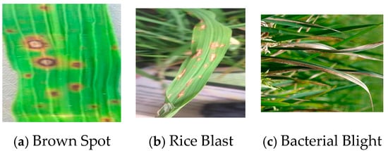 Ensuring food security is pivotal for global peace and sustainability, with China contributing approximately a quarter of the world’s grain production [1]. As a staple food, rice is cultivated on 12% of the world’s arable land and sustains more than half of the global population [2,3,4]. However, the prevalence of rice diseases significantly impacts yield and quality, leading to substantial economic losses. Early and precise disease detection is essential for effective management [5], yet conventional manual inspection techniques are frequently imprecise, labor-intensive, and expensive. To address these challenges, computer-vision-based methods have been explored. Early approaches relied on traditional techniques such as background subtraction, template matching, and feature extraction. For instance, Qi et al. [6] integrated multi-scale feature fusion for small-target detection, while Bansal et al. [7] enhanced feature extraction using the Shi–Tomasi and SIFT algorithms. Despite their progress, these methods struggled with robustness in complex environments (e.g., varying growth stages, weed interference) and limited accuracy for small-scale diseases like Rice Blast [8].