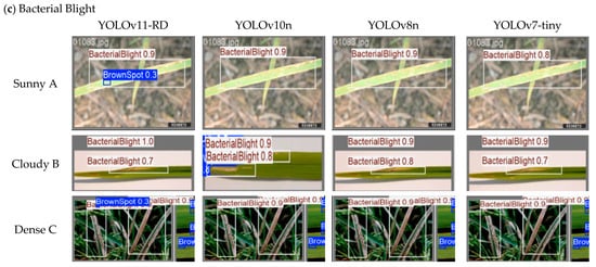 Practically, YOLOv11-RD effectively addresses the limitations of insufficient feature expression and low precision in traditional rice disease detection by introducing innovative modules such as SPPFLKC and C3k2-CFCGLU, significantly enhancing detection capabilities for small targets and dense areas in complex farmland environments. From a societal perspective, this model enables highly accurate real-time detection, reducing diagnostic delays, preventing disease spread, optimizing labor allocation, and cutting costs. The experimental results show improvements of 2.7% and 11.5% in mAP50 and mAP50-95, respectively, with a reduction of 4.58 M in the parameters and 1.1 G in the computational cost. This lightweight design not only improves accuracy but also ensures efficient deployment on resource-constrained systems. Future research should focus on optimizing the model’s generalization ability, deeper integration with edge computing devices, and exploring multi-modal data (e.g., spectral images, meteorological data) to further enhance detection performance, driving rice disease detection technology toward greater intelligence and efficiency.