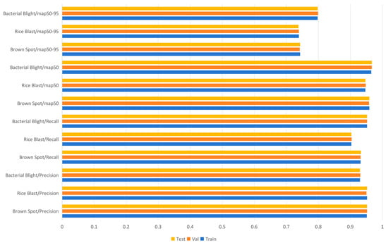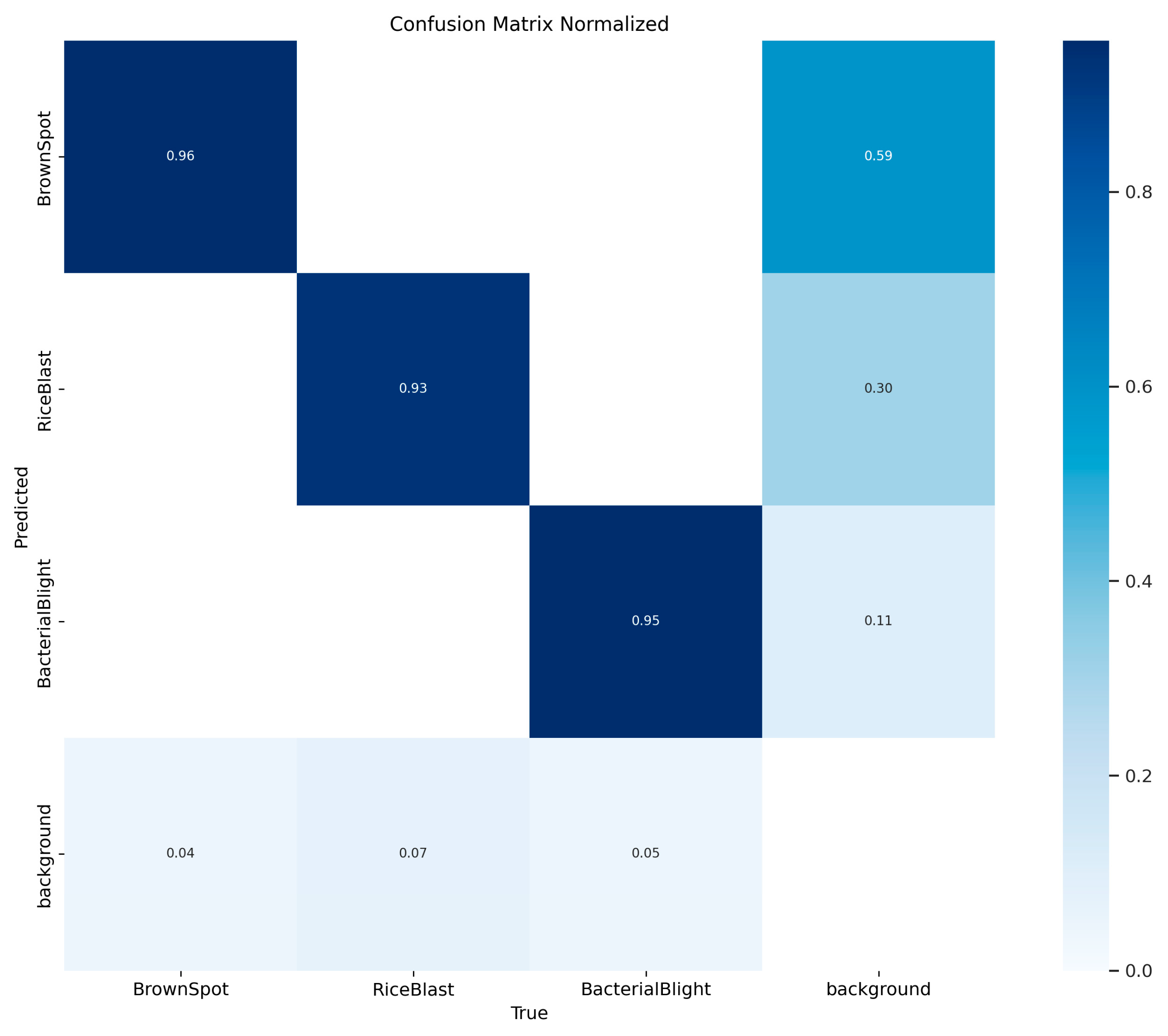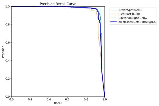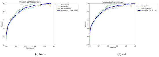 Figure 19 and Figure 20 show the loss and accuracy curves of the YOLOv11-RD model on the training and validation sets, respectively. The loss curves indicate that both training and validation losses decrease and stabilize, demonstrating good fitting and generalization. The accuracy curves reveal that for “Brown Spot”, “Rice Blast”, and “Bacterial Blight”, the accuracy closely matches the confidence curves, with a minimal performance gap between the validation and training sets. These results highlight the model’s high consistency during training and validation, indicating no significant overfitting. Moreover, as confidence increases, the accuracy of each category improves steadily, confirming the model’s excellent generalization capabilities.