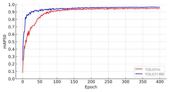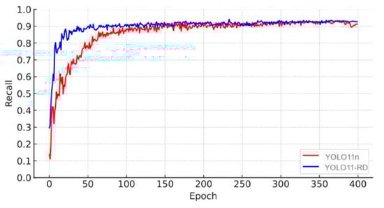 Figure 17 and Figure 18 depict the comprehensive performance of recall and mAP50 for YOLOv11n and YOLOv11-RD after 400 training epochs. The figures show that YOLOv11-RD not only achieves more stable convergence compared to YOLOv11n but also experiences faster performance gains. Specifically, during training, YOLOv11-RD demonstrates superior learning capabilities, with precision values increasing at a notably quicker pace than YOLOv11n. This highlights YOLOv11-RD’s significant advantages in both detection accuracy and stability.
