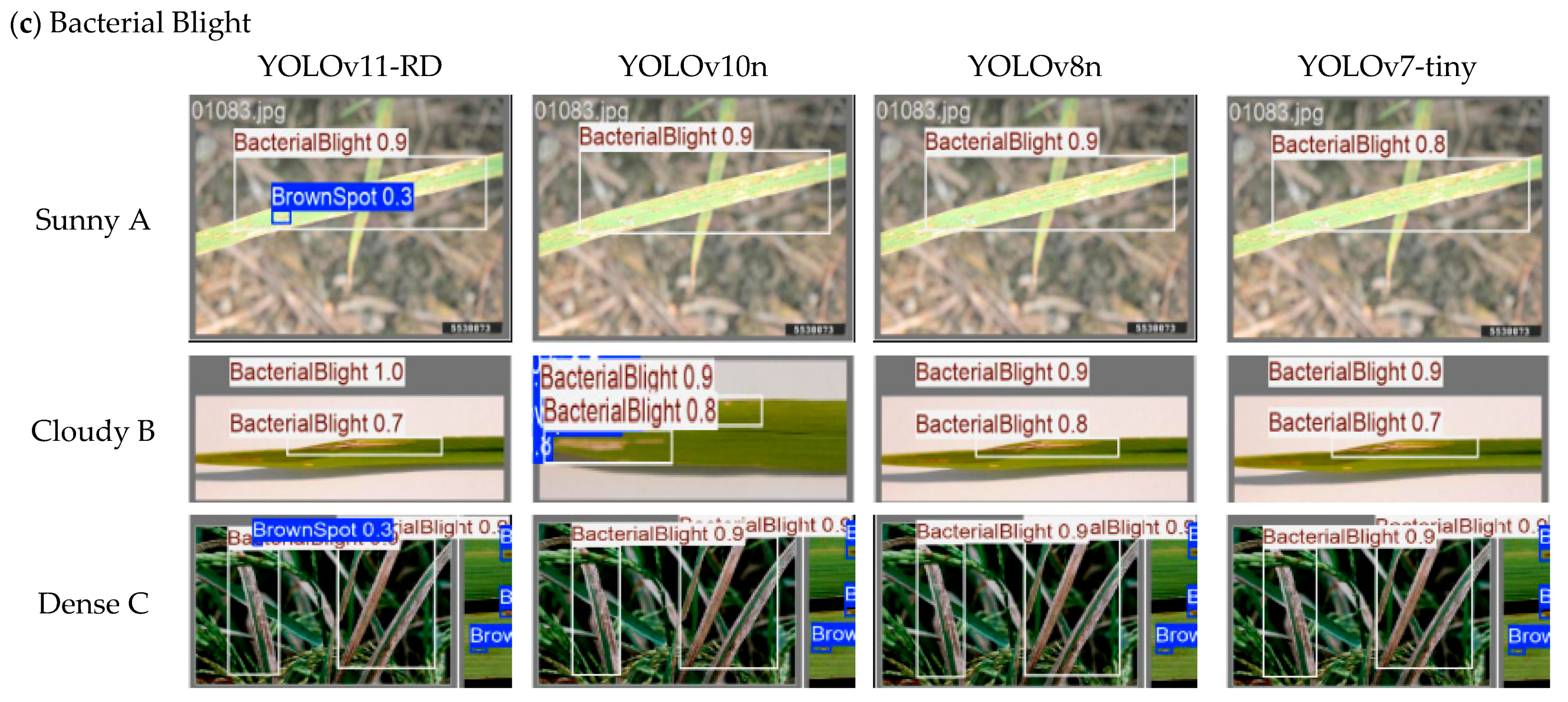 YOLOv11-RD was integrated into a DJI Agras T30 drone for real-time rice disease monitoring. The model successfully detected diseases (e.g., Rice Blast) in 320 × 320 resolution images at 20 FPS, with latency below 50 ms. Compared to YOLOv11n, the lightweight design reduced data transmission overhead by 22%, ensuring stable performance even under 4 G network bandwidth constraints.