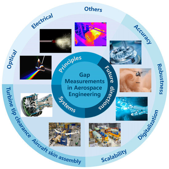 This review provides an in-depth analysis of precision micro-gap measurement sensor technologies within the aerospace sector. The overall framework of this study is shown in Figure 1. It begins with an examination of the fundamental measurement principles, followed by a comparison of the advantages and limitations of the commonly used sensor technologies. Furthermore, this review highlights application systems for micro-gap measurements and explores potential directions for future development. Special attention is given to the performance of these sensors in complex aerospace environments, particularly addressing the challenges of adaptability, accuracy, and reliability under extreme operating conditions.