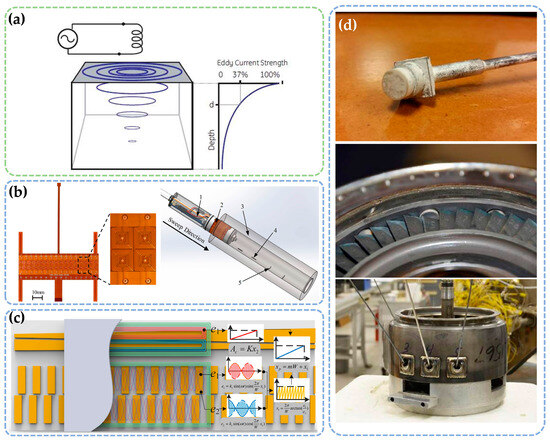 Micro-gap measurement sensors based on the electromagnetic induction method. (a) Working principle. (b–d) Typical application scenarios [49,51,52].