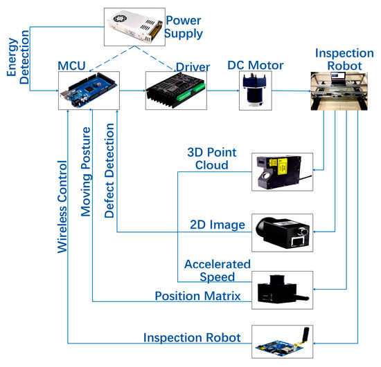 In the design process of the HRT robot sensor module and control system, the first thing to consider is the start and stop and acceleration and deceleration of the HRT robot through wired and wireless remote control, as well as the real-time collection and processing of rail faults and damage and signal transmission feedback. Figure 2 shows the schematic diagram of the control system of the HRT robot.