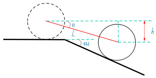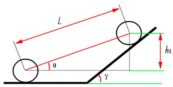 For hill climbing obstacle motion (CS), as shown in Figure 3, the transient posture diagram of the HRT robot with a hill climbing obstacle motion time in moments is shown. is the front and rear wheelbase of the HRT robot, and the upward bending angle of the steel rail is . The angle between the HRT robot and the steel rail is , is the height difference between the front and rear axles of the HRT robot, and the acceleration during climbing obstacles is ; the speed is . The HRT robot’s acceleration and speed can be expressed as follows:
