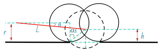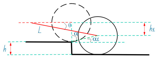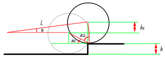 For the descending step obstacle movement (DS), as shown in Figure 5, the transient posture diagram of the HRT robot’s descending step obstacle movement at time is shown. represents the front and rear wheelbase of the HRT robot, and the height of the step where the steel rail forms a “step” defect is ; the height difference between the front and rear axles of the HRT robot after completing the down step movement is ; is the angle between the center of the front and rear wheels when the robot completes the downward step movement; is the angle between the robot and the steel rail after completing the down step movement, and the angle between the HRT robot and the steel rail after completing the down step obstacle movement is ; the HRT robot’s wheel radius is ; the acceleration during the upper stage motion is , and the speed is ; the HRT robot’s acceleration and speed can be expressed as follows: