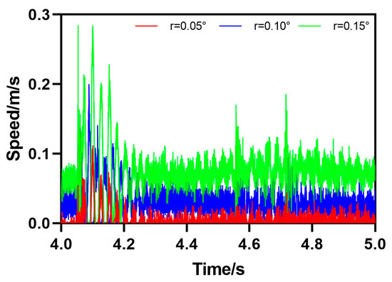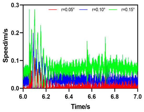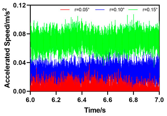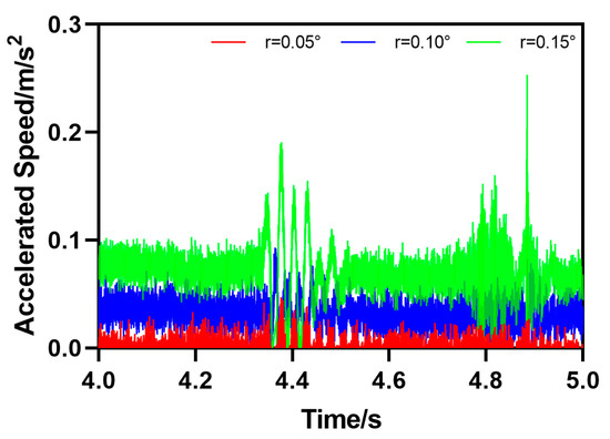 The fifth type of rail defect is the downward slope obstacle movement (DO), which means that the rail forms a certain angle with the horizontal plane . The motion attitude parameters of HRT robots passing through track defects can be calculated by Formula (5). As shown in Figure 16, the HRT robot is at the included angle , which is 0.05°, 0.1°, or 0.15°. The initial value of the angle formed between the steel rail and the horizontal plane is 0. As the robot moves forward, the acceleration of the robot will undergo a sudden change when encountering downhill obstacles, and then the acceleration value will continue to increase in a short period of time; , , and ; the speed value also increases continuously and continues to decrease after reaching its peak, , , or . From the curve, it can be seen that the acceleration and velocity motion curves of the robot undergo significant abrupt changes at 5.753 s. It can be determined that the robot is passing through the DO defect at 5.753 s and finally approaching the initial value state, as shown in Figure 17.