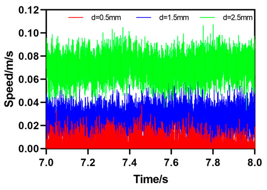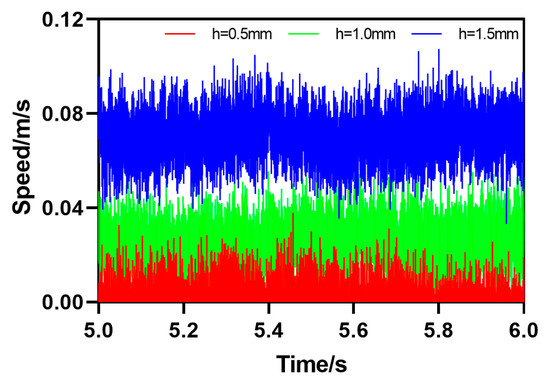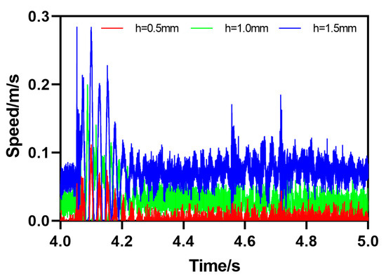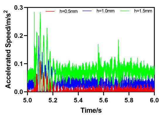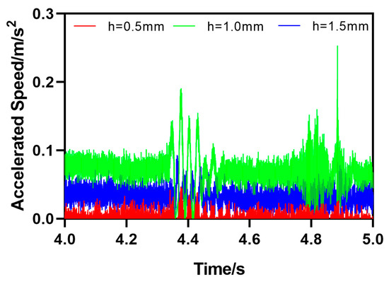 The second type of rail defect is the upward step obstacle movement (US), which means that there is a certain height difference between the rail and the horizontal plane . The motion attitude parameters of HRT robots passing through track defects can be calculated by Formula (2). As shown in Figure 10, the HRT robot has a height difference of , which is 0.5 mm, 1.0 mm, or 1.5 mm, and the initial value of the height difference between the steel rail and the horizontal plane is 0. As the robot moves forward, the acceleration of the robot will undergo a sudden change when encountering step obstacles, and then the acceleration value will continue to increase in a short period of time; , , and . After reaching its peak, i.e., after passing through the step obstacle, the acceleration returns to its initial value. The speed value also increases continuously, reaching its peak and continuing to decrease to the initial value, , , or , until reaching the initial value state at the end. From the curve, it can be seen that the acceleration and velocity motion curves of the robot undergo significant abrupt changes at 4.638 s, indicating that it is passing through the CS defect at 4.638 s and finally approaching the initial value state, as shown in Figure 11.