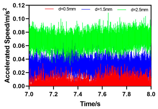 The third type of rail defect is the descending step obstacle movement (DS), which means that there is a certain height difference between the rail and the horizontal plane ; the motion attitude parameters of HRT robots passing through track defects can be calculated by Formula (3). As shown in Figure 12, the HRT robot has a height difference of , which is 0.5 mm, 1.0 mm, or 1.5 mm; the initial value of the height difference between the steel rail and the horizontal plane is 0. As the robot moves forward, the acceleration of the robot will undergo a sudden change when encountering step obstacles, and then the acceleration value will continue to increase in a short period of time; , , and ; after reaching its peak and after passing through the step obstacle, the acceleration returns to its initial value. The speed value also increases continuously, reaching its peak and continuing to decrease to the initial value, , , or , until reaching the initial value state at the end. From the curve, it can be seen that the acceleration and velocity motion curves of the robot undergo significant sudden changes at 5.77 s, indicating that it is passing through the DS defect at 5.77 s and finally approaching the initial value state, as shown in Figure 13.