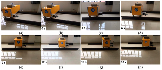 In order to test and verify the motion posture and rail fault detection method of the HRT robot on the track, a testing test platform was built. The steel rail was fixed on the ground, with a total length of 3 m, and composed of 4 sections, 2 sections of 2 m and 2 sections of 1 m, which can be used to construct rail groove gap defects, step defects, and slope defects for the experimental verification of HRT robot testing. The test experimental platform in Figure 18a–h shows the motion posture of the HRT robot running on the track. The average speed of the HRT robot during operation is . During the experiment, a manual power control line was specially set up to cut off the power in real-time in case of emergency. Within 0–3 s, the HRT robot operates normally on the track. Within 3–9 s, the robot is about to pass through various rail faults and defects. Within 9–5 s, the HRT robot will complete various rail fault and defect obstacles. Within 15–18 s, after successfully completing various rail faults and defects, the HRT robot operates normally. Throughout the entire testing process, the motion stability of the HRT robot is not affected by rail faults and defects. However, various rail faults and defects can affect the motion posture of the HRT robot, mainly including sudden changes in acceleration and speed when passing through a fault and defect.