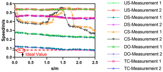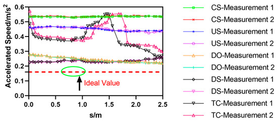 During the HRT robot experimental testing process, five types of fault defects, TC, CS, US, DS, and DO, were set on a 3 m steel rail. The HRT robot was tested twice, and the motion acceleration and velocity changes of the HRT robot after passing through the five types of fault defects were recorded and statistically analyzed. The motion acceleration analysis results are shown in Figure 19, and the motion velocity analysis results are shown in Figure 20. When the HRT robot went through five types of fault defects, the acceleration suddenly changed, exceeding the ideal value, and an error rate of 97% was achieved in two experiments with the same fault defects. When the HRT robot underwent five types of fault defects, its speed underwent sudden changes, exceeding or approaching the ideal value, and the error rate of the same fault defect in two experiments was 98%. In Figure 19 and Figure 20, the horizontal axis represents the displacement distance of the robot. The physical quantity of the displacement distance is denoted by “s”, and the unit is meters (m).