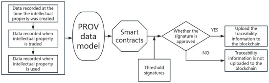 The standardized traceability information obtained through the PROV data model needs to be further verified by the threshold signature scheme before it can be uploaded to the blockchain, and the smart contract will judge the uploading status of the traceability information according to whether the signature result passes or fails, i.e., if the signature succeeds, then the traceability information will be uploaded to the blockchain; if the signature fails, then the traceability information cannot be uploaded. The main role of the smart contract in the uploading stage of traceability information is to complete the unified conversion of data recorded in the creation, transaction, and use stages of intellectual property rights into a standardized JSON format and upload the traceability information after the threshold signature is successful.