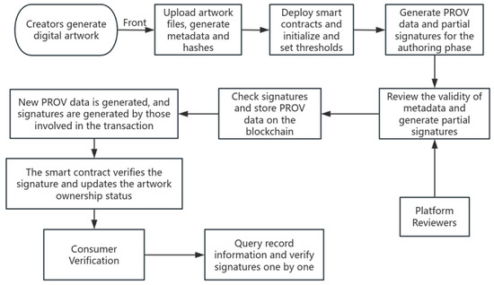 Figure 3 below analyzes the application of the PROV model in the traceability process by simulating the digital artwork traceability scenario. First, the creator of the digital artwork uploads the original data of the digital artwork (pictures, videos, etc.) through the front-end interface, generates the metadata and hash value, and the creator sets the threshold signature threshold value through the smart contract. The metadata of the digital artwork generates the traceability data of the artwork at the creation stage through the prov data model, and after the trading platform audits the legitimacy of the traceability information (multiparty signature authentication), it submits the traceability information of the creation stage (the creation time of the digital artwork, the identity of the creator, the metadata of the artwork, and other key information) and some of the signatures to the blockchain for storage. After the artwork is traded, new PROV data (including timestamps and partial signatures of the previous stage) and partial signatures are generated, the legitimacy of the signatures is verified through smart contracts, and the ownership of the digital artwork is updated at the same time. The use of the digital artwork (e.g., secondary creation or commercial use) is still recorded through PROV, and the smart contract is invoked to upload the blockchain after the signature is passed. Consumers or other verifiers can verify the signature through PROV data information and realize the credible query of traceability information.