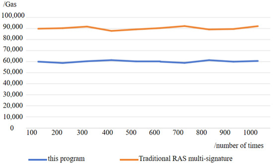 Simulating the Ethernet network through the Ganache local test, Figure 5, Figure 6, Figure 7 and Figure 8 show the delay time and Gas consumption of a single transaction completed by the test transaction verification under the test condition of concurrent transactions increasing from 100 to 1000, respectively. The data shows that the average delay of single transaction information verification is around 35 ms, and the value of Gas is around 6000 on average. Comparing the average delay of 60 ms and gas consumption of around 9000 under the traditional RSA multi-signature condition shows the superiority of this scheme in terms of performance.