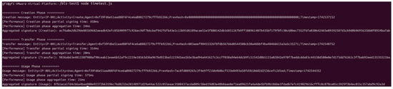 The test script traces intellectual property through three stages: creation (create), transaction (transfer), and use (use), generates partial signatures at each stage, then aggregates these signatures, measures the time to generate signatures and the time to aggregate at each stage, and outputs them to the console. Figure 9 shows the three stages of traceability information (create, transfer, and use), traceability information structure (entity, activity, and agent), signature, and private key information.