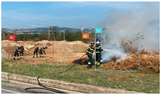 Figure 2. FFs of Team 1 performing different tasks during fire suppression phase. In area R (red box), FFs are clearing the ground using rakes. In area S (orange box), a FF is providing hose support while in area L (light blue box), a FF is actively extinguishing a controlled fire with the hose. - ‘Stop 3’: 1 min of data collection during the post-suppression recovery phase to assess physiological return to baseline.