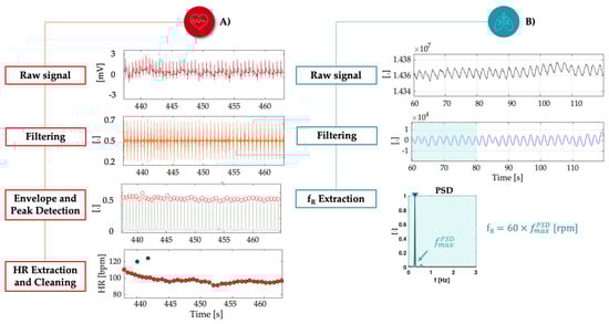 (A) Segment of raw ECG signal collected from the chest strap device of subject ‘S3’ in phase ‘Stop 2’, filtered ECG, envelope of the filtered signal and detected beats in red marks, followed by the HR estimated from the peaks after cleaning the extra beats in blue marks. (B) Breathing raw signal collected by the strap, filtering and processing of a signal segment using the Welch method, the selection of a 20 s sliding window, and the extraction of the maximum frequency and subsequent fR.