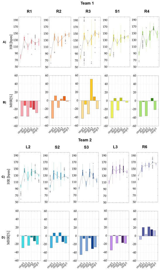 (A,C) Boxplots of HR values for each phase of each FFs (all subjects of each team, Team 1 and Team 2, are reported), where the central black dot indicates the median, and the bottom and top edges of the boxes indicate the 25th and 75th percentiles, respectively. The whiskers extend to the most extreme data points not considered outliers, and the outliers are plotted individually using the black ‘+’ markers. (B,D) Percentage of Maximum Heart Rate (%MHR) for each firefighting phase and subject. This chart displays how each participant’s HR compares to their age-adjusted 85% HRmax during each phase of the protocol.