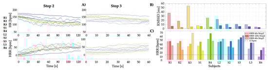Specifically, the HR trend over time during these intervals was analyzed, where a decreasing pattern associated with recovery was expected: the decline in HR during recovery is principally due to a reactivation of the parasympathetic nervous system, mostly in the early recovery period. In contrast, the HRR, calculated by comparing each HR value of the resting phases with the maximum HR reached at the end of the previous intense exercise phase (HR0), was expected to show an increasing pattern (Figure 5A). From these curves, values of HRR at 60 s epochs were extracted to evaluate the recovery progress at each minute. In the first recovery phase, ‘Stop 2’, two values were obtained, HRR60 and HRR120, while in the final recovery phase, ‘Stop 3’, only HRR60 was recorded.