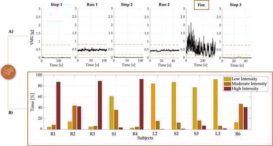 For example, during the ‘Stop 1’, ‘Stop 2’, and ‘Stop 3’ phases, all subjects-maintained activity levels under 0.2 g, showing coherence in low-intensity values across these resting phases. In contrast, during the running phases, all subjects exhibited moderate intensity levels, remaining within the 0.2 g to 0.8 g range. During the ‘Fire’ phase, activity intensity varied according to the specific task performed by each FF (see Figure 6B). During this phase, the highest maximal air temperatures were observed by the thermistors during the direct attack, with temperature peaks indicating the intense conditions faced by FFs. Specifically, the maximum temperatures reached were approximately 39.5 °C for Team 1 and 40.3 °C for Team 2. In terms of percentage distribution, FFs performing tasks that involved using rakes to manage surrounding debris (i.e., ‘R1’, ‘R2’, ‘R3’, and ‘R4’ in Team 1, and ‘R5’ and ‘R6’ in Team 2) maintained high-intensity levels (above 0.8 g) for a substantial portion of the time: three subjects remained in the high-intensity range for more than 85% of the time, while two others spent over 40% of their time at this intensity. On the other hand, those engaged in handling the hose for direct fire suppression (‘L1’ in Team 1, and ‘L2’ and ‘L3’ in Team 2) or providing hose support (‘S1’ in Team 1 and ‘S2’ in Team 2), which involved more static postures, exhibited lower intensity levels (below the high-intensity threshold) for over 60% of the time. This data-driven analysis highlights how activity intensity varies with specific firefighting tasks, providing insights into the physical demands associated with different roles.