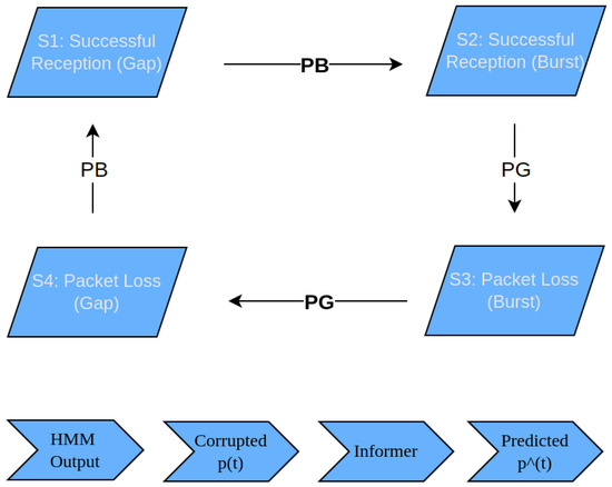 The four-state HMM is selected for its ability to effectively model complex patterns of burst and random errors, providing a more detailed representation of packet loss dynamics. While simpler models like the Gilbert or two-State HMM exist [28,29], the four-state HMM offers a structured approach to distinguishing between packet loss and successful reception during burst and gap periods. This enables a more accurate simulation of network conditions, which is crucial for high-performance TI environments. Figure 2 provides a visual representation of the HMM state transitions and their integration into the Informer prediction framework.
