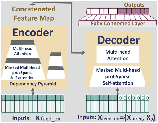 The Informer encoder efficiently processes long sequential inputs, balancing memory use and computational efficiency. Input sequences are transformed into matrices , with self-attention distilling ensuring only essential features are retained. Inspired by techniques in dilated convolutions [30,31], the transformation from layer j to follows.