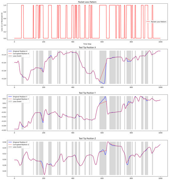 Parts 2–4 of Figure 4 depict the original and corrupted positions of the robotic arm’s tool tip along the X, Y, and Z axes under simulated packet loss conditions. The solid black line represents the ground truth position, while the red dashed line illustrates the corrupted position data resulting from packet loss. The gray areas indicate the time intervals during which packet loss occurs.
