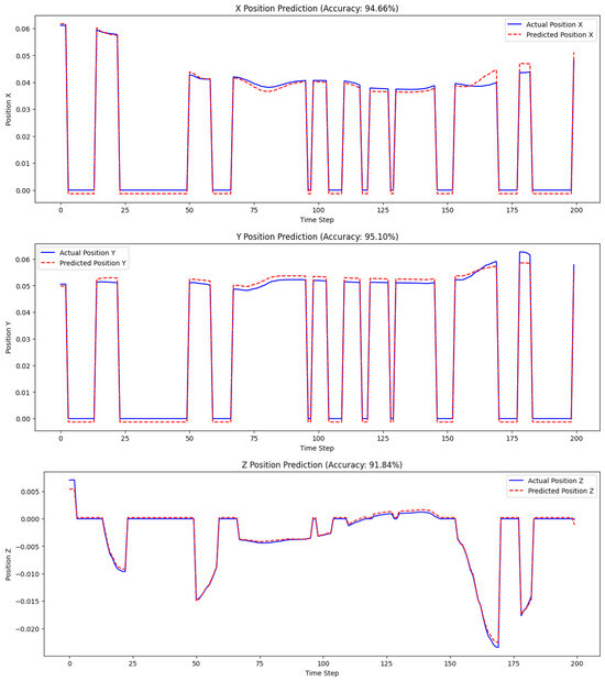 - Y position prediction accuracy is 95.96%. Similarly, the model performs effectively in predicting the Y-axis position. The predicted values align almost perfectly with the actual values, except for minor deviations during sharp transitions, demonstrating the robustness of the model.