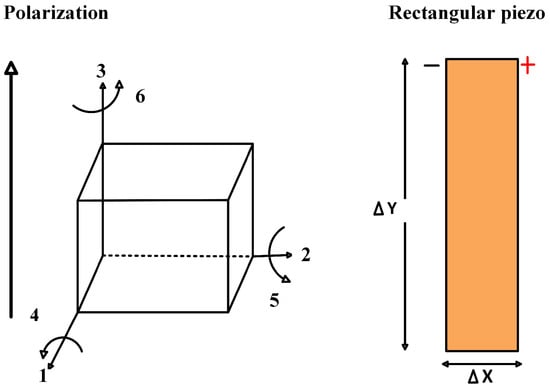 Piezoelectric properties differ for electrical/mechanical excitation along different directions. Once a piezoelectric material is chosen for a particular application, it is important to set the mechanical and electrical axes of operation. The orientation and poling axis strongly influence the piezoelectric effects. These axes are set during “poling”, which induces piezoelectric properties in the piezoelectric material. This polarization generates an electric field that can transform the mechanical energy used in the material’s deformation into electrical energy. The polarization generates an electric field, which causes the flow of the free charges in the conductor. In Figure 1, the piezoelectric material’s directions and orientation axes are shown. The axes X, Y, and Z represent the orthogonal coordinate system; axes 4, 5, and 6 are the axes of rotation. There are two commonly known piezoelectric modes of operation to harvest energy, i.e., the 3-1 loading mode and the 3-3 loading mode [10,11,14,15]. In the 3-1 loading mode, the direction of the electric field is perpendicular to the direction of the force applied. In the 3-3 mode, both the external stress and the generated voltage are aligned in the same direction [9,11,14,15].