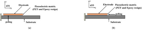 Orientation of piezoelectric materials with electrode polarization. (a) d31 Orientation. (b) d33 Orientation.