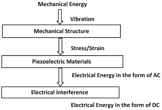 In modeling an Energy harvester, it consists of piezoelectric materials, a mechanical structure and electrical energy interference. Mechanical structure uses due to input vibration; stress is developed over the surface of the piezoelectric materials. The output of electrical energy in the form of voltage is developed by these materials. In Figure 3 Energy Transducers, Energy Management and Energy Storage for several subsystems energy harvester to provide energy to the electronic application under suitable and stable voltage specification. Piezoelectric materials are continually being developed to create more effective transducers that enhance the piezoelectric properties and improve the efficiency of converting mechanical energy into electrical energy in energy harvesting applications. One example of an innovative piezoelectric transducer is the macro fiber composite (MFC) transducer, which was pioneered by NASA in 1996 [18,19,20,21,22]. The IEEE standard assumes that piezoelectric materials are linear. When poled piezoelectric materials are subjected to mechanical strain, they become electrically polarized, resulting in a fixed electric charge on the material’s surface (direct piezoelectric transducer).