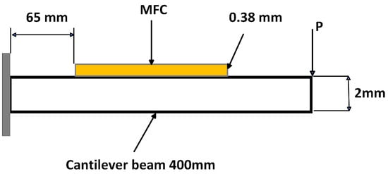 where the deflection of the beam at position x and time t is represented as ; is the flexural rigidity of the beam (including the MFC layer); c is the damping coefficient; is the mass per unit length of the beam (including the MFC layer); is the dynamic force applied at the free end ; is the Dirac delta function representing the point load at the free end; and is the piezoelectric force generated by the MFC [21,22,23].