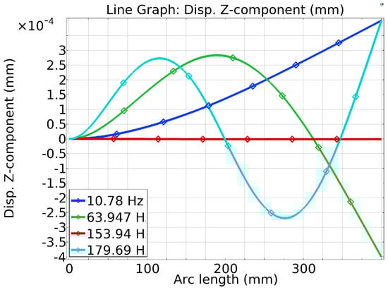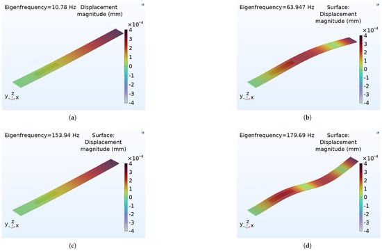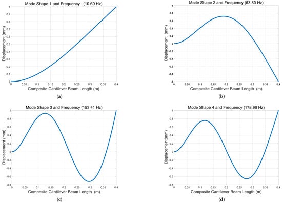 Modal analysis is performed to identify mode shapes and resonant frequencies. The natural frequency is the frequency at which a system oscillates when displaced from its equilibrium position and allowed to vibrate freely. For a cantilever beam, the natural frequencies depend on its material properties, geometry, and boundary conditions. The mode shape describes the deformation pattern of the beam at a specific natural frequency. This shape represents the beam’s vibrational configuration when oscillating at its natural frequency, with each natural frequency corresponding to a unique mode shape. For free vibration, the external excitation is assumed to be zero (P(t)); Equation (21) is simplified to
