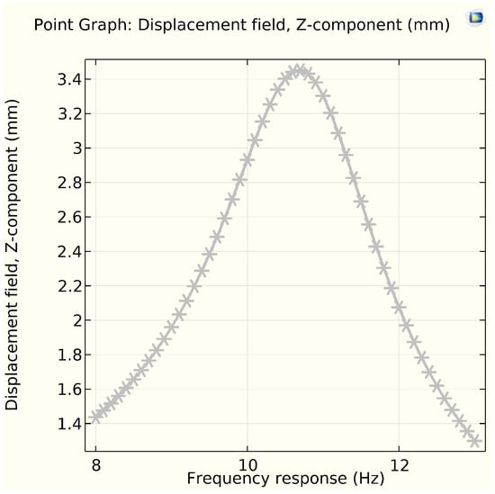 As showin in Figure 13, the output power obtained using both analytical and numerical methods across the resonance frequency range of 10.65 and 10.5 Hz is the peak power near the resonance frequency, respectively. For analytical methods, the peak (maximum) power is approximately 0.0031 mW. Meanwhile, for numerical simulations, the maximum electrical output is around 0.0029 mW. The shapes of both graphs are similar. The analytical graph is not as smooth as that of the numerical approach because it reflects the assumptions of linearity and the simplified boundary conditions. Therefore, the analytical method is mostly useful for initial approximation, while the numerical approach is suitable for detailed analysis and performance optimization.