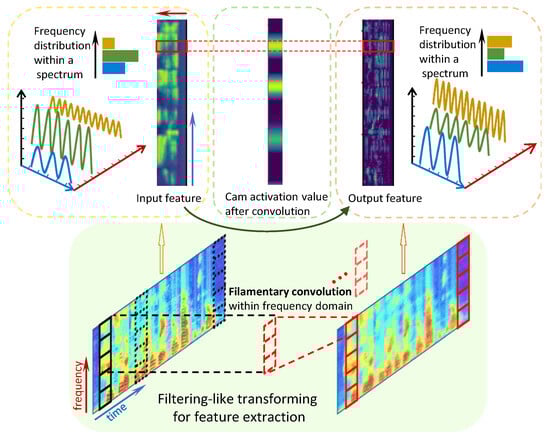 Filamentary convolution operates within the spectra of TFAFs, ensuring parallel operations on each short-time spectrum. This parallel processing maintains feature consistency across different short-term spectra. Due to weight sharing in convolution, each operation behaves akin to a “filter”. More precisely, we employ “filtering-like” to describe this process, because filamentary convolution conducts identical (or parallel) computations on frequency components at different time steps (frames), resulting in one (or multiple) channels of features with consistent input–output sizes. While this resembles the fundamental concept of filtering, “filtering” typically focuses on the removal of specific frequency components, whereas filamentary convolution emphasizes the remapping and encoding of features within the frequency domain. Therefore, it cannot be strictly termed “filtering”.