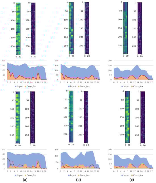 Given these considerations, the “filtering-like” filamentary convolution offers specialized operations compared to traditional rectangular-shaped convolution or temporal 1-D convolution, particularly emphasizing frequency-domain feature extraction. In Figure 3, we depict the feature maps of three different languages before and after filamentary convolution, alongside their frequency distributions. Horizontally, (a), (b), and (c) represent three distinct languages. Vertically, we compare two different samples in each language. It intuitively reveals that the overall frequency distribution undergoes changes after filamentary convolution. Furthermore, for each language, we compare the frequency distributions after the filamentary convolution of two samples, indicated by red lines corresponding to the upper sample. We observe that the output frequency distributions of samples from the same language tend to be more similar compared to samples from different languages.