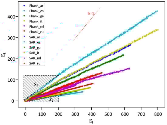 The star symbols in the Figure 5 represent Fbank samples, while circular symbols represent SAR samples. All star samples are present on the right side of the reference line with slope , which indicates that the frequency continuity of the Fbank features is higher than the time continuity. SAR exhibits a similar characteristic. Furthermore, we observe that, under equal frequency-domain continuity, , indicating lesser temporal continuity in SAR, thus rendering this feature sparser overall. The introduction of the STFT enables Fbank to become a relatively suitable feature for subsequent classifier analysis in terms of temporal continuity.