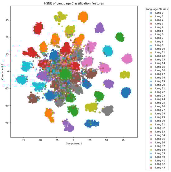 The corpus covers 44 languages, with the names and abbreviations listed in Table 4. Recordings marked with ∗ are from OpenSLR, while the rest are from Common Voice. Training, validation, and testing sets are randomly selected at 60%, 20%, and 20%, respectively, for each language, with all audio files standardized to a 48kHz sample rate. Furthermore, we present the t-SNE distribution for our dataset using FCK-NN in Figure 6.