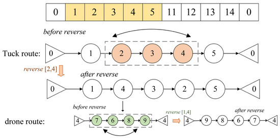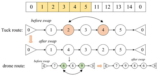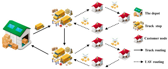 With technological improvements, unmanned aerial vehicles (UAVs), as an innovative technology [1], possess the benefits of rapidity, mobility, and cost-efficiency, and have proven their efficacy across multiple sectors, including aerial photography [2], agriculture [3], firefighting [4], medical services [5], and logistics [6]. Due to their unique advantages, UAVs possess considerable potential for research in the field of logistics and distribution. In 2013, Amazon in the United States initially proposed using drones for product delivery. By 2024, companies such as SF Express (SF Express Co., Ltd., Shenzhen, China), JD.com (JD Logistics, Beijing, China), and Meituan (Meituan Dianping, Beijing, China) had implemented standardized drone delivery routes successfully. In 2023, Zhang et al. [7] integrated the advantages of drones with urban logistics scenarios, establishing a logistics drone path planning model and conducting simulation experiments that demonstrated the benefits of using drones for logistics delivery. In 2024, Zhang et al. [8] conducted material research on drones, improving their wings to significantly reduce delivery costs in logistics applications. Chen et al. [9] designed a drone-based parcel pickup and delivery system based on a Radio Map, ensuring reliable communication quality during the parcel exchange process. In 2025, Liu et al. [10] proposed a two-stage algorithm for optimizing drone paths in logistics delivery, ensuring both energy efficiency and flight safety. These studies collectively validate the feasibility of drone technology in logistics delivery and highlight its growing maturity and potential in the field. Nevertheless, the smaller sizes of drones and their aptitude for short-range and smaller-scale deliveries impose constraints on servicing consumers with elevated demand at extended distances, whereas vehicles have superior load capacity and long-distance transport capabilities. Combining vehicles and drones for delivery could maximize efficiency.