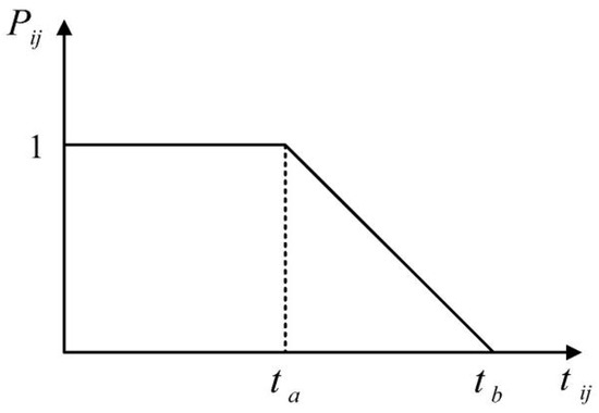 Generally, customers demand short delivery time. Thus, there is no minimum time requirement for delivery but there is a maximum time limit for delivery, which is a single-sided soft time window [29]. The time reliability function [30,31,32] has no impact on the objective function in the time range . Considering that customer satisfaction generally decreases gradually over time within a reasonable delay range, this process is approximated as a linear function in this paper to simplify the computational complexity of the model. In the subsequent delay interval, the time reliability function reduces the value of the objective function at a particular rate in the time range . The time reliability function reduces the objective function to zero in the time range . The time reliability function is illustrated in Figure 2.